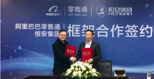 阿里巴巴集团副总裁、零售通事业部总经理林小海(左)与红蓝集团运营中心总裁许水深(右)签订战略合作协议